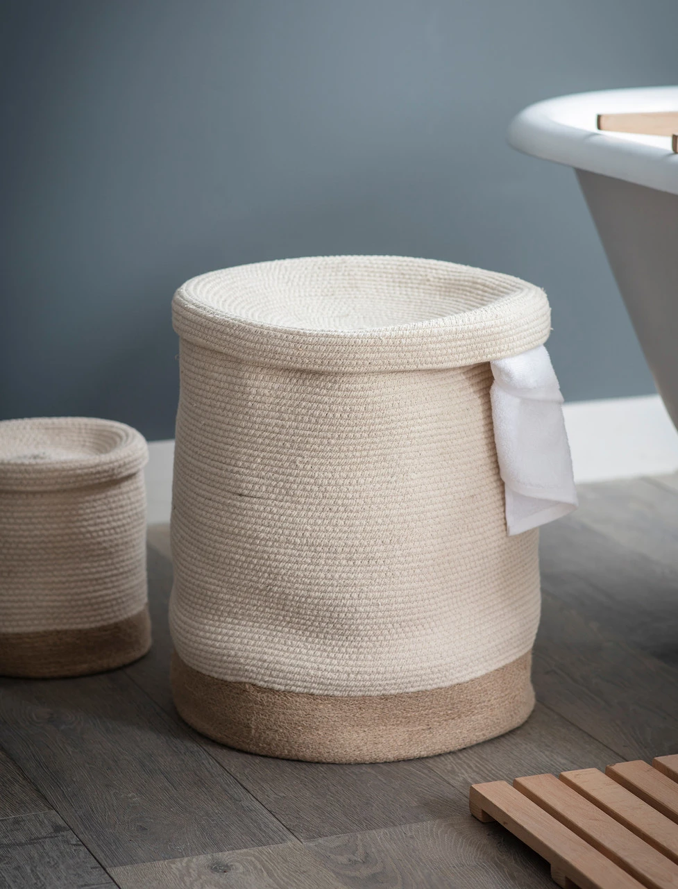 The Beckley: two-tone smart storage for the bathroom and utility. Woven from jute, the set of 2 are made for accessories…
